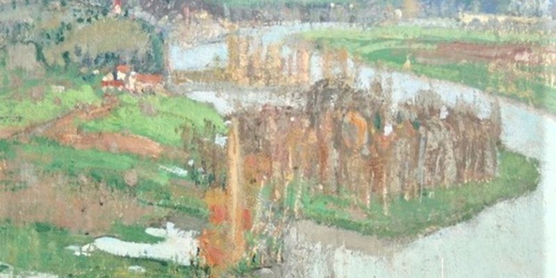 La montée des eaux, autour du cingle de la rivière déformée, offre à Maleville un sujet de composition intéressant où s’entremêlent le bleu de cobalt, les ocres jaune et rouge, le blanc de zinc, le vert émeraude.