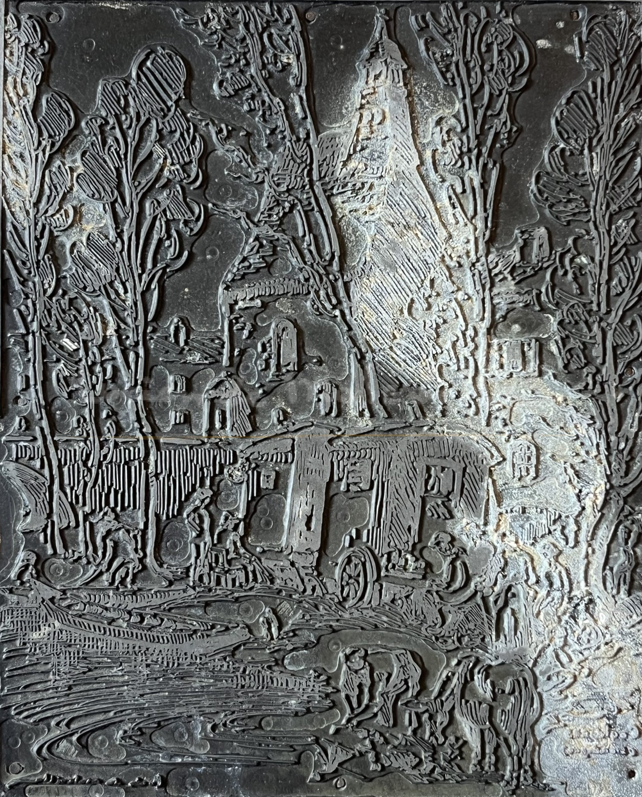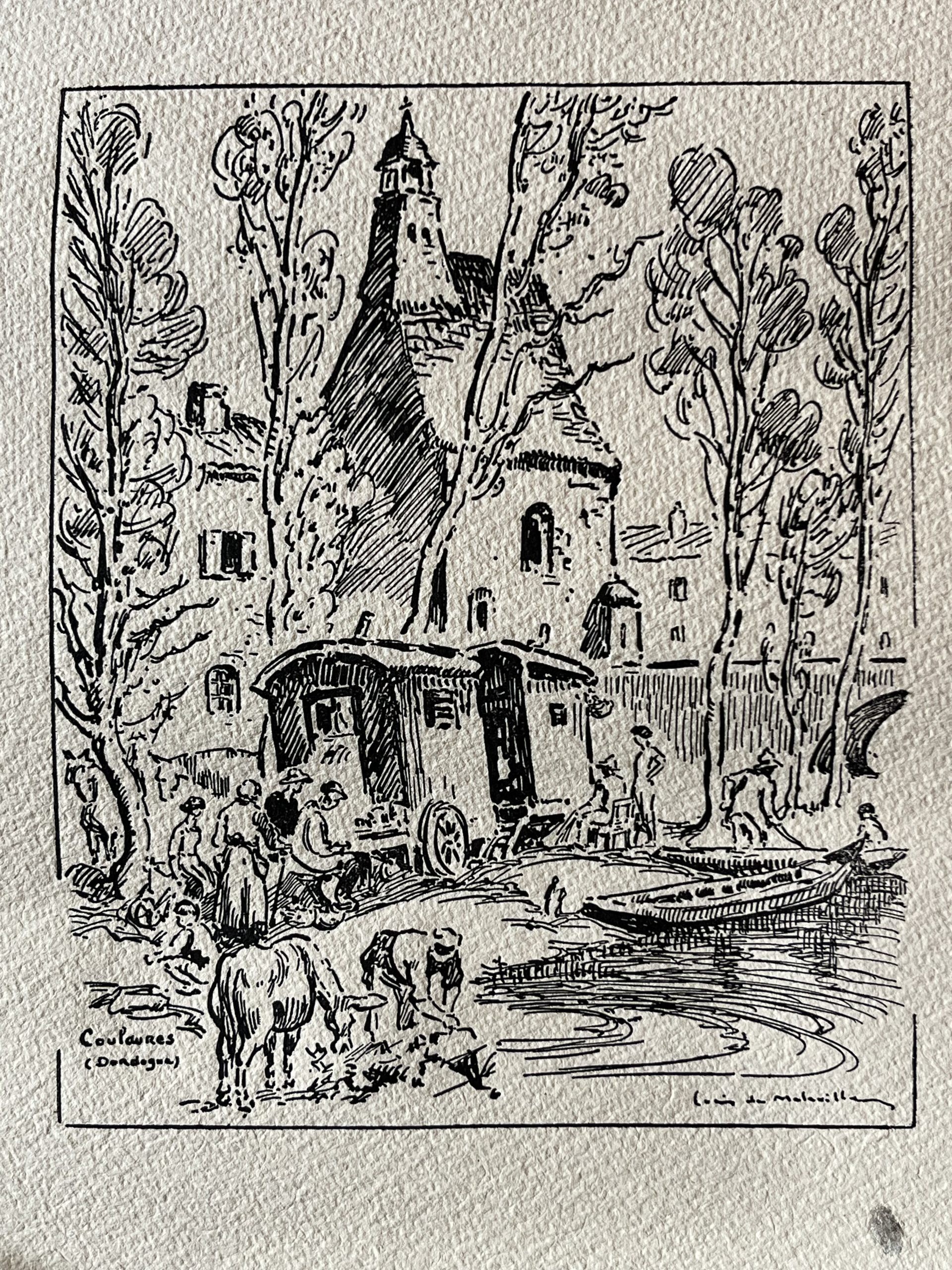 Tirage de gravure à l’eau forte accompagné de sa plaque originale cuivre représentant Coulaures en Dordogne, plus précisément une scène de village avec roulottes sur les berges de la La Loue.